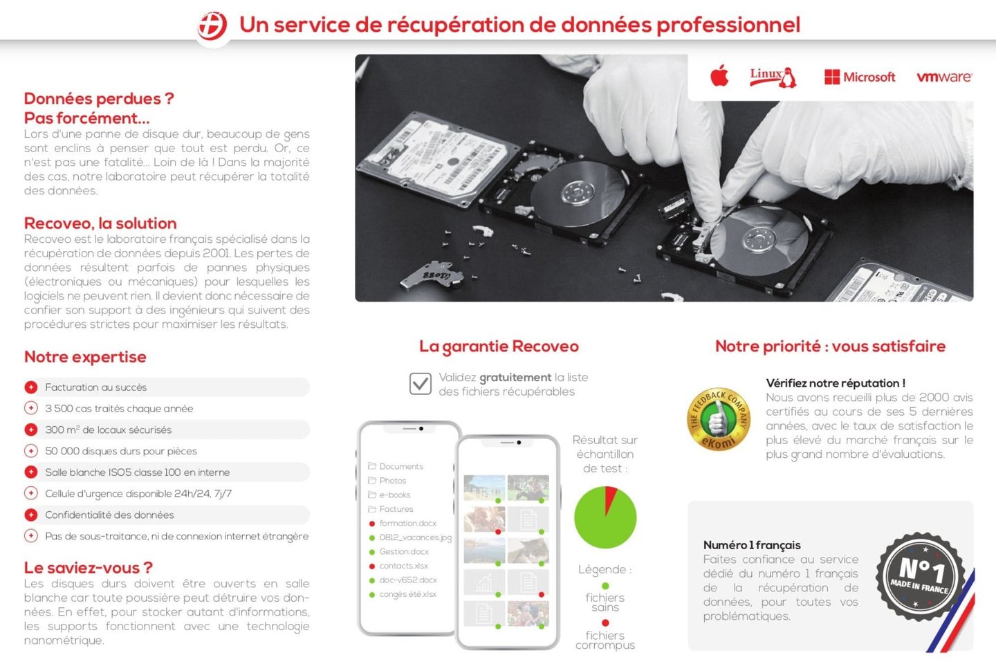 Pour les cas complexes, Dépannage Informatique 03 s’appuie sur un laboratoire spécialisé : Recoveo, expert français en récupération de données.